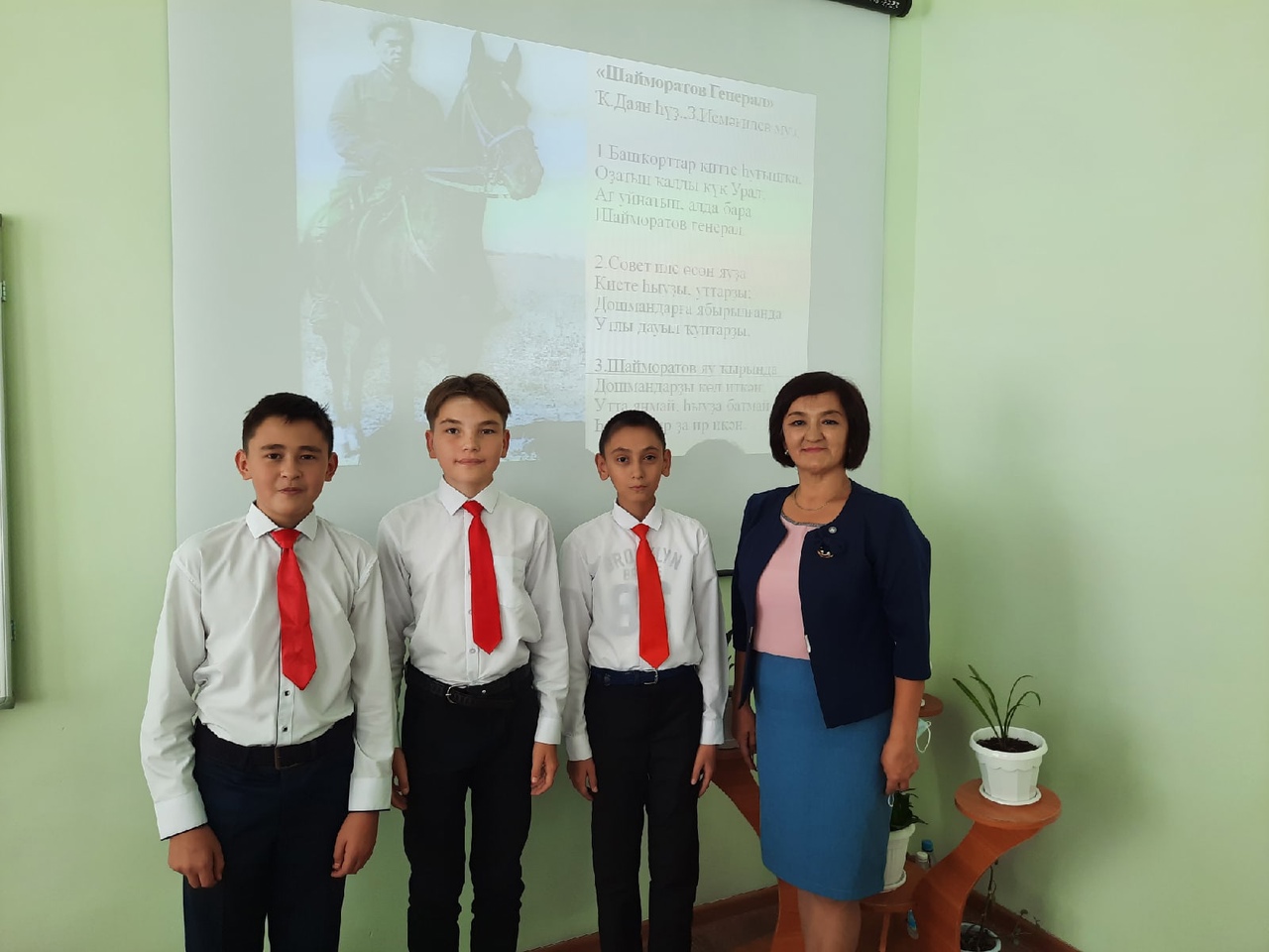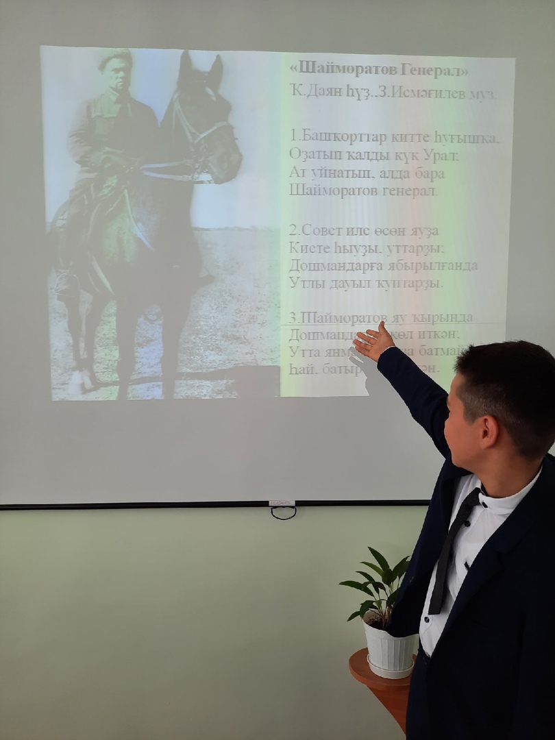 Учитель башкирского языка и литературы Л.Н.Минниахметова провела в 5а классе классный час на тему "Генерал Шаймуратов". Учителями Л.В.Байчуриной, А.М.Муталлаповой организован тематический урок в 7б классе. Обучающиеся исполнили песню "Генерал Шаймуратов". Учащиеся 9в класса под руководством Р.Н.Каиповой приняли участие на круглом столе, посвященном 112-й Башкирской кавалерийской дивизии.